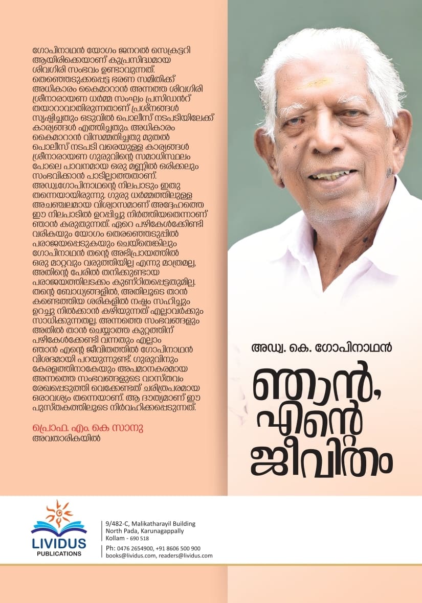"ഞാൻ, എന്റെ ജീവിതം" presents the life story of Adv. K. Gopinathan, offering readers an inside look at his journey as the General Secretary of SNDP Yogam. The autobiography sheds light on his steadfast dedication, the challenges he faced, and his role during pivotal moments in Kerala's socio-religious history, including the Shivagiri incident.