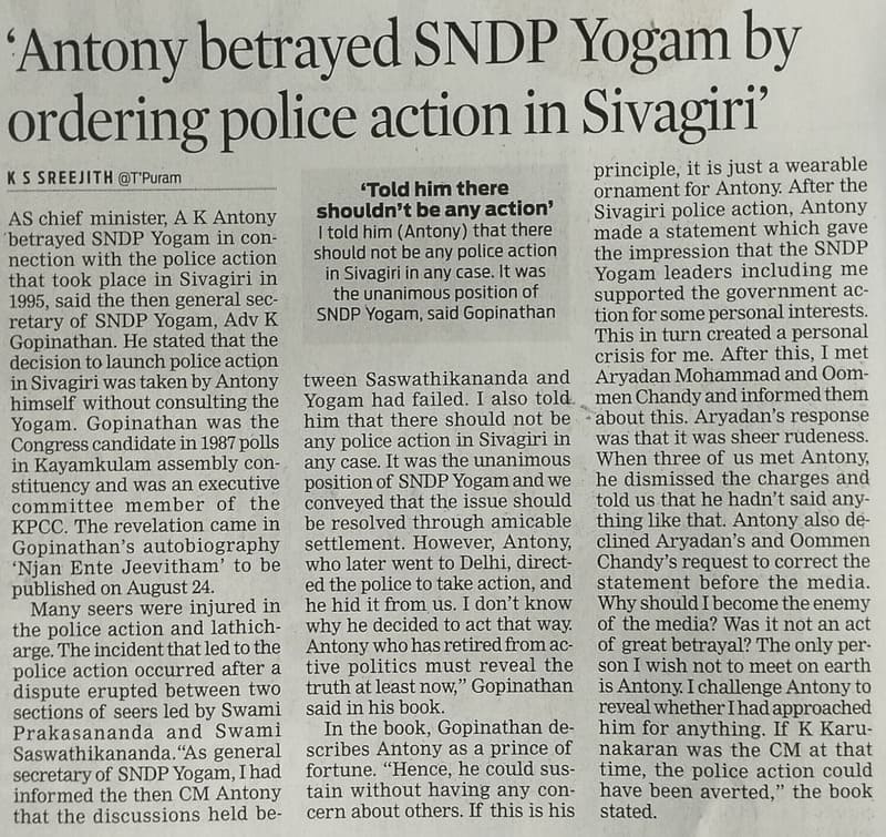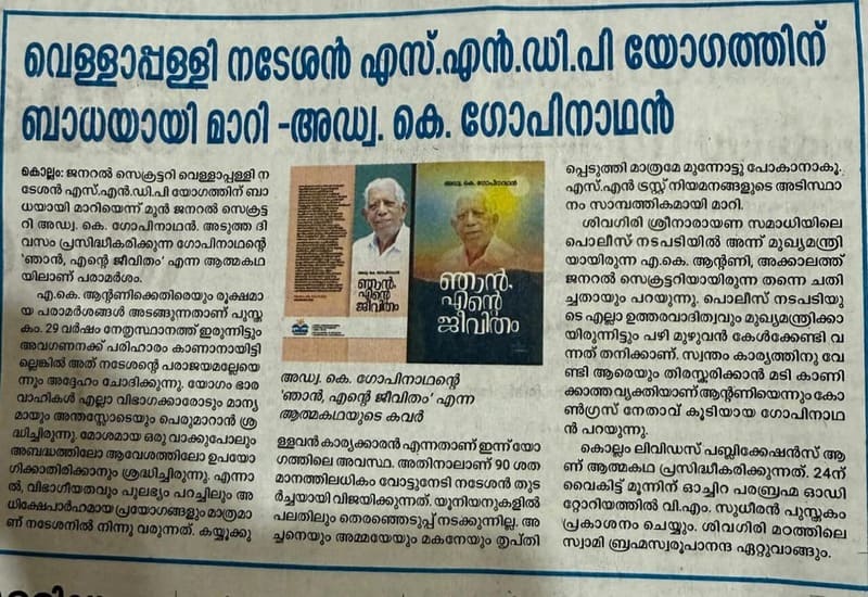 Adv. K. Gopinathan's leadership and social contributions have been featured in notable news outlets. His perspectives on the SNDP Yogam's developments, community issues, and historical events have garnered media attention over the years.